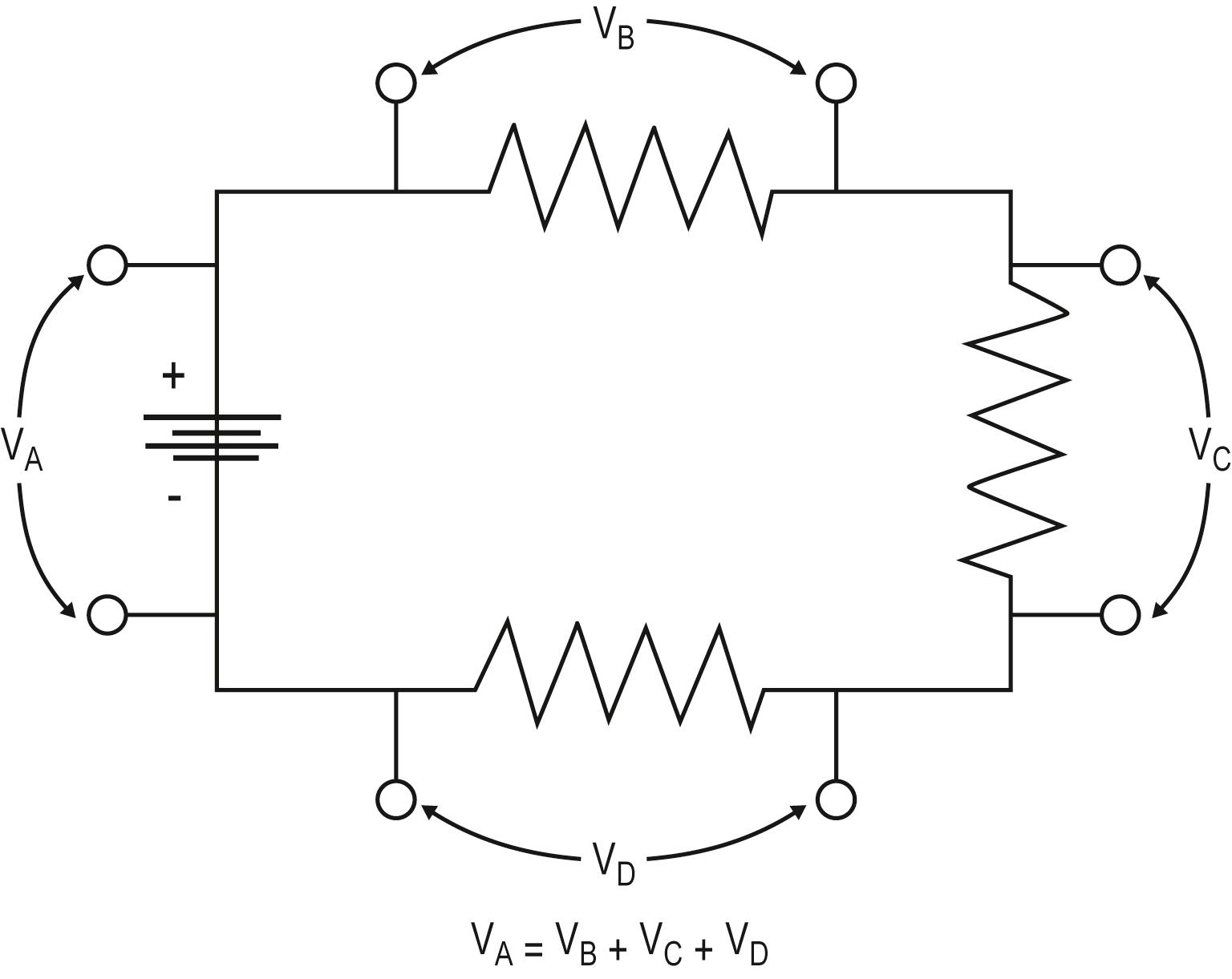 Kirchhoff’s voltage law states that, in a closed circuit, the algebraic sum of all the voltage (i.e., potential) drops is equal to the electromotive source voltage of the circuit. The previous figure shows a battery with a voltage ( V A ) connected in series to three resistors (B, C, D). The current running through the three resistors results in a voltage drop across each resistor, V B , V C , and V D , respectively. Kirchhoff’s voltage law requires that the sum of the voltage drops across all three resistors equals the voltage of the battery (i.e., V B + V C + V D = V A ).