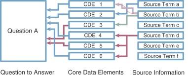 Core data elements represent the most granular source information that can be logically combined or mapped in multiple ways to generate answers (values) to specific questions (variables). Schematically, this is shown in the following diagram for six core data elements (CDE) from sources a-f.