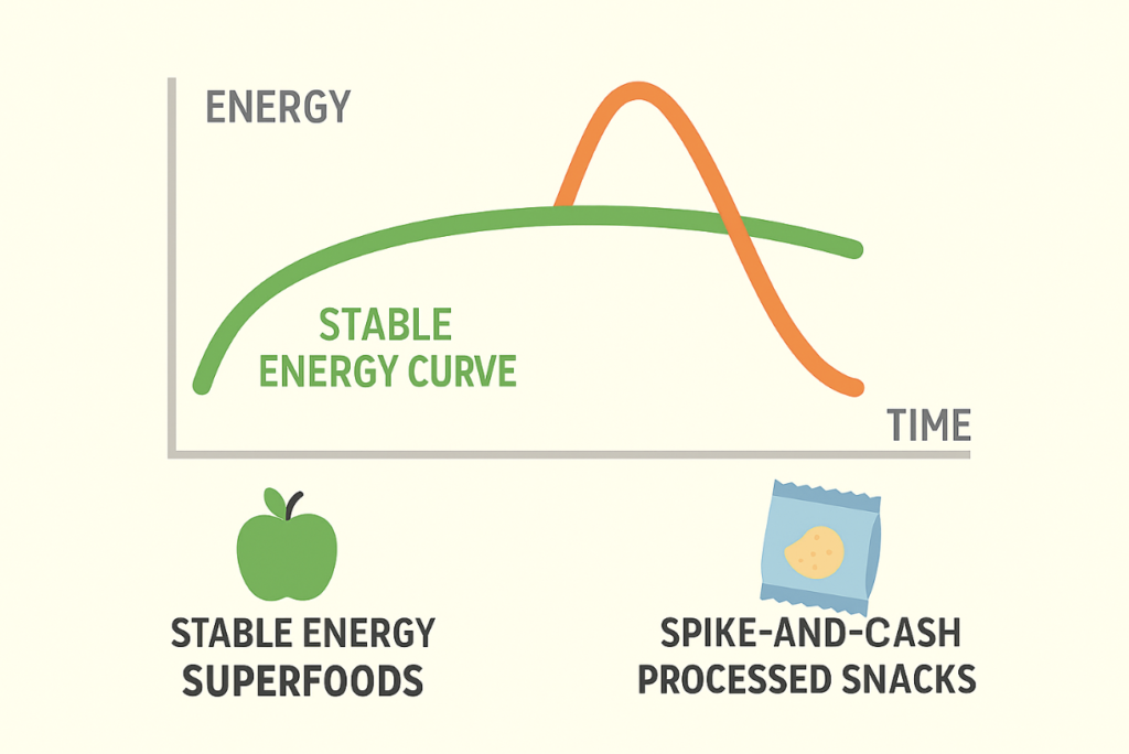 It is important to know that energy comes from balanced nutrition. Processed snacks give short highs and quick crashes. Superfood supplements support steady release.